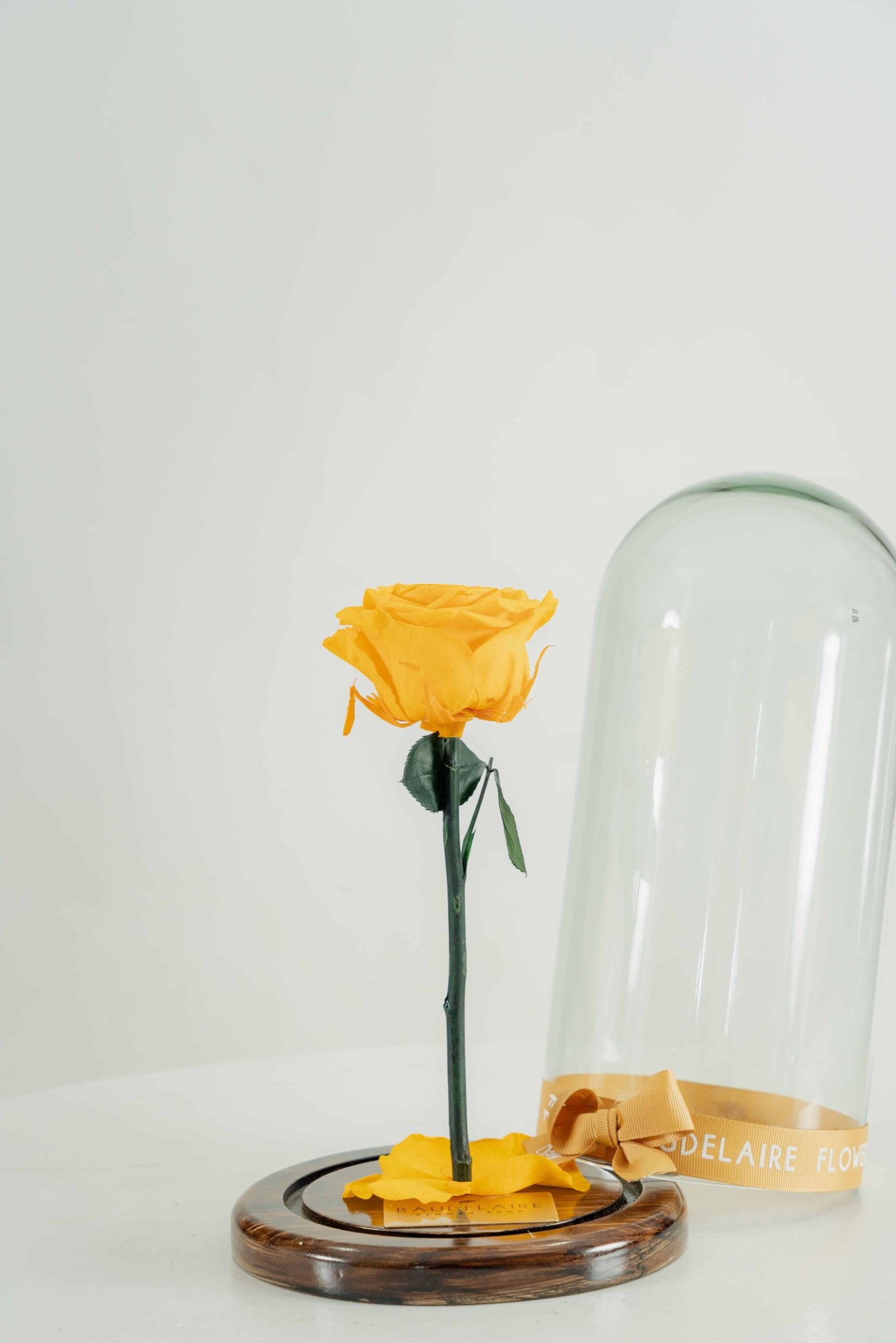 – Rosa amarilla preservada: Mantenida en su estado natural para conservar su belleza.